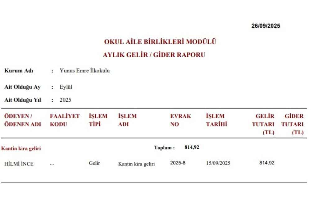 Yunus Emre İlkokulu Okul Aile Birliği Eylül 2025 Gelir Gider Kayıtları